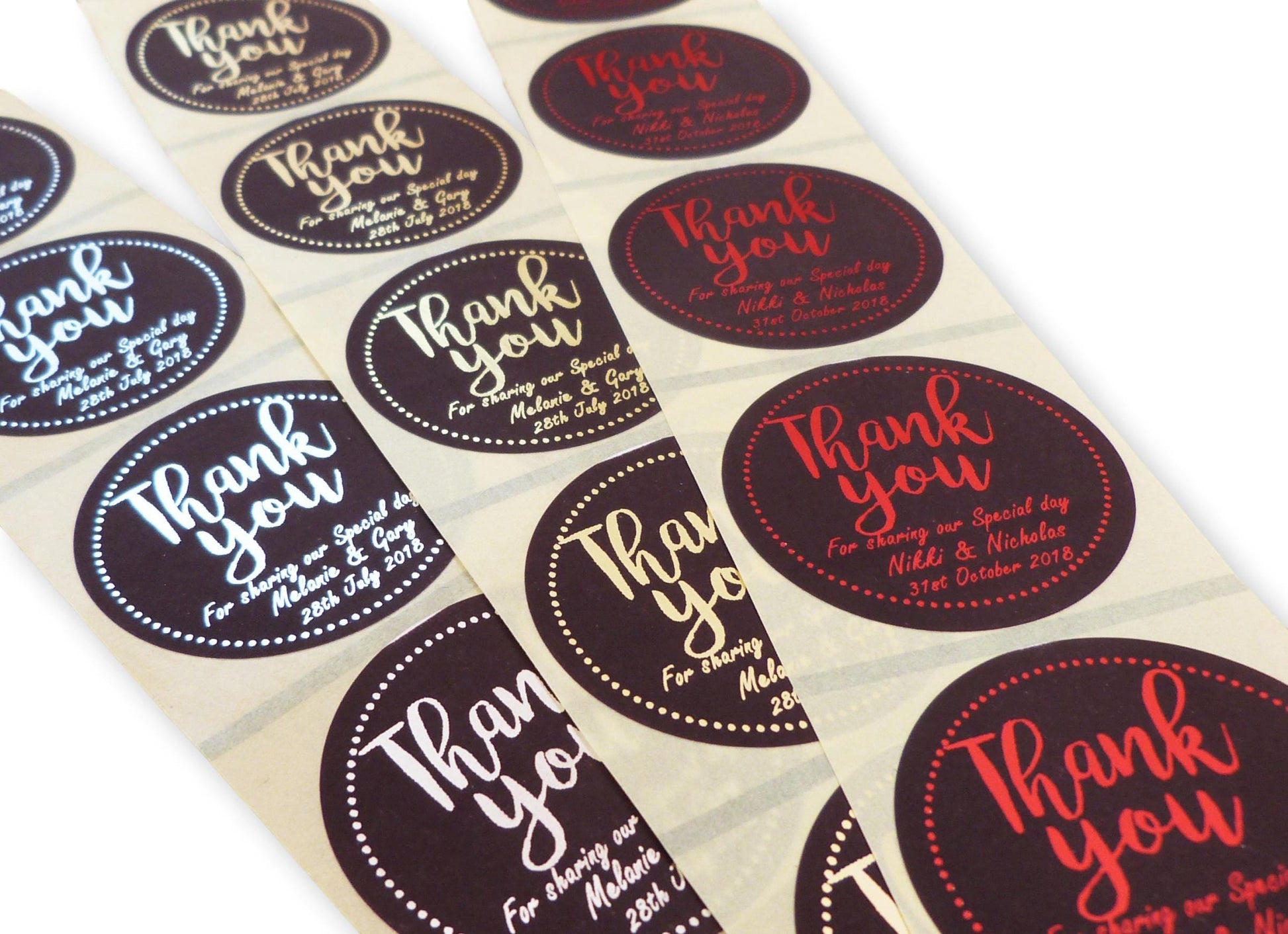 50 x Round black 45mm foil printed labels thank you gold silver red stickers weddings birthdays