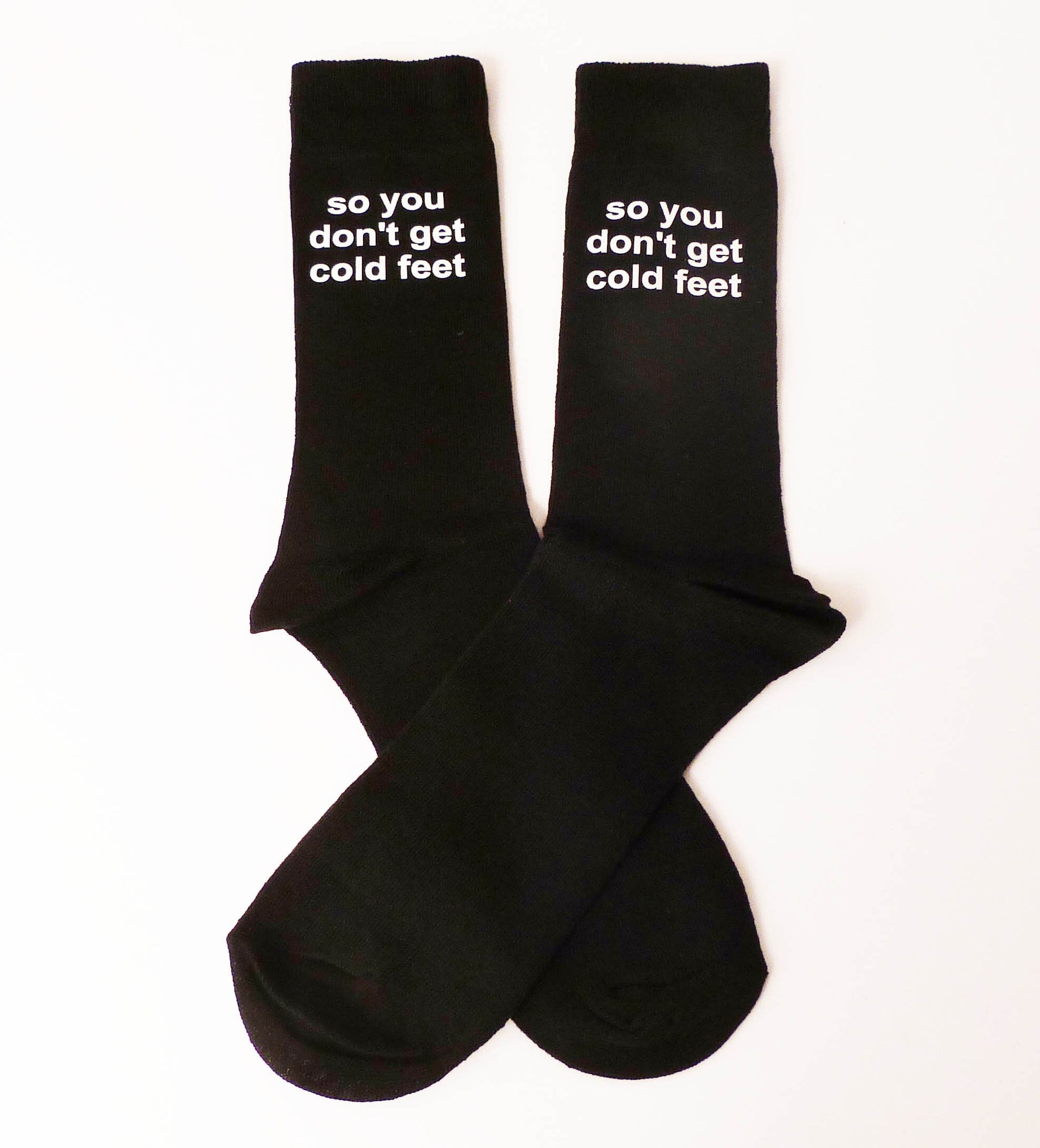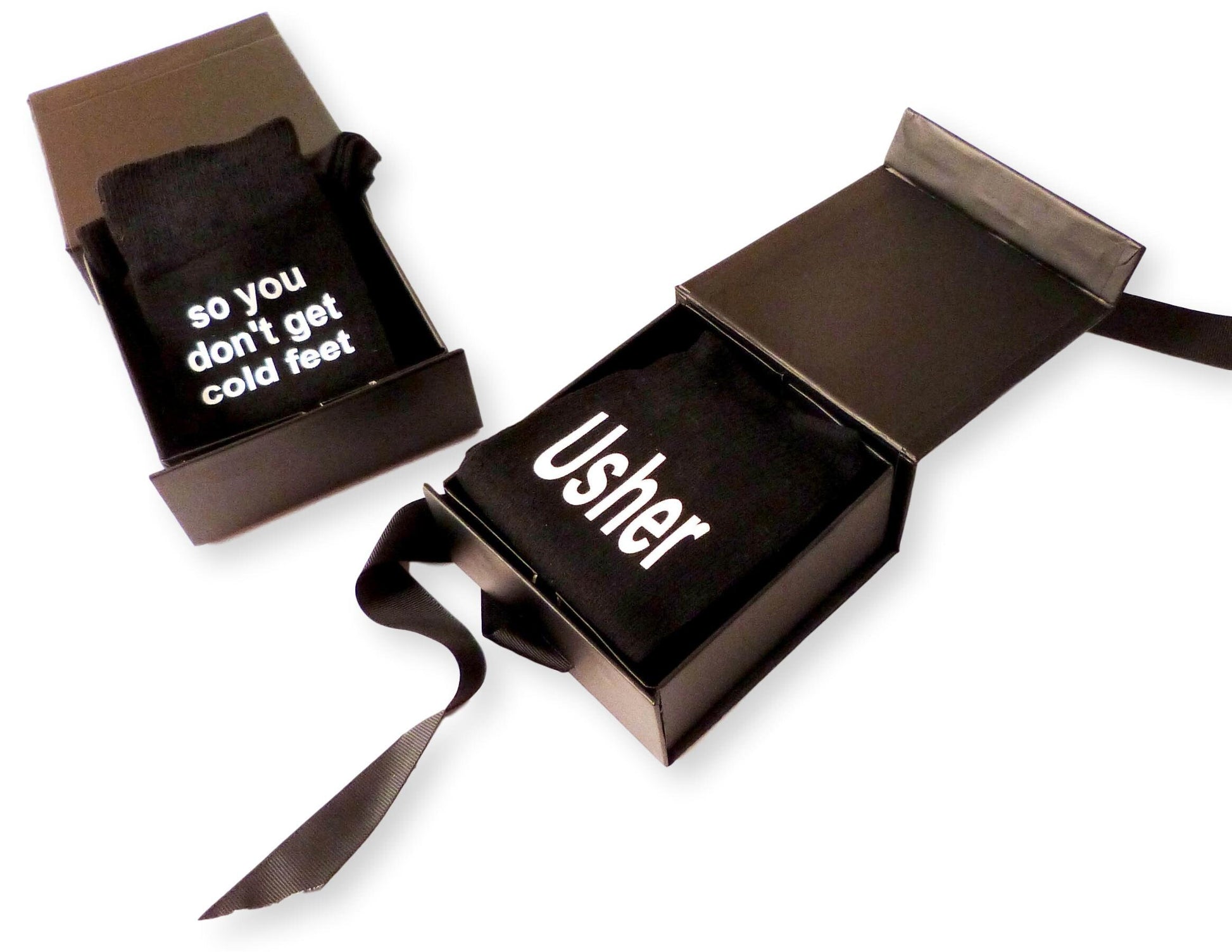 Personalised black wedding socks with gold foil printed name gift box and ribbon bow - cold feed groomsmen