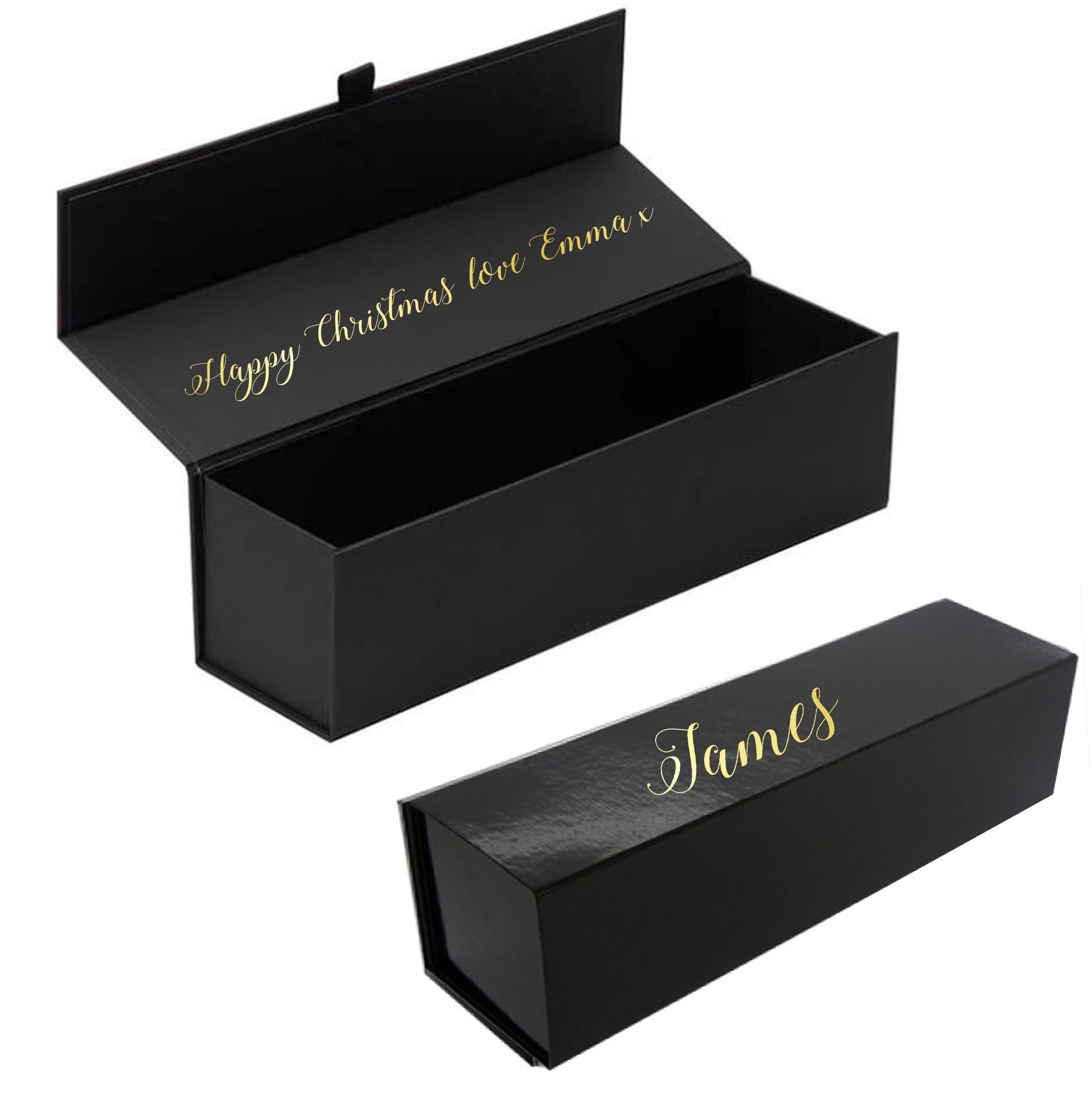 Personalised black wine bottle box gold foil name christmas birthday gift and inside message champagne prosecco