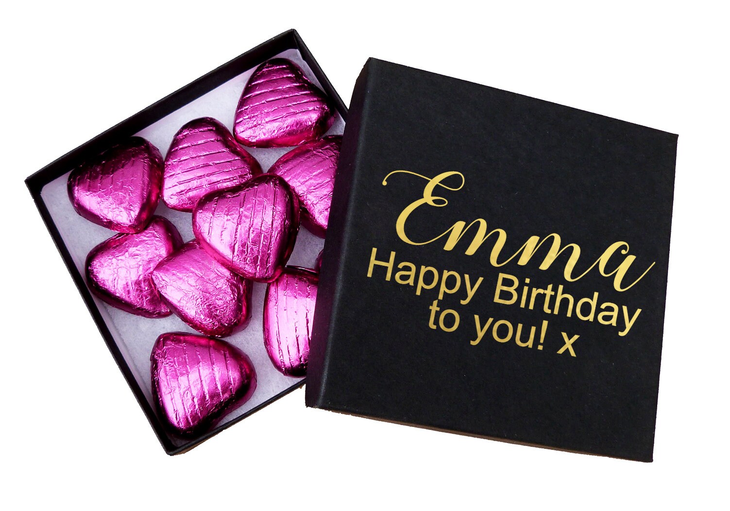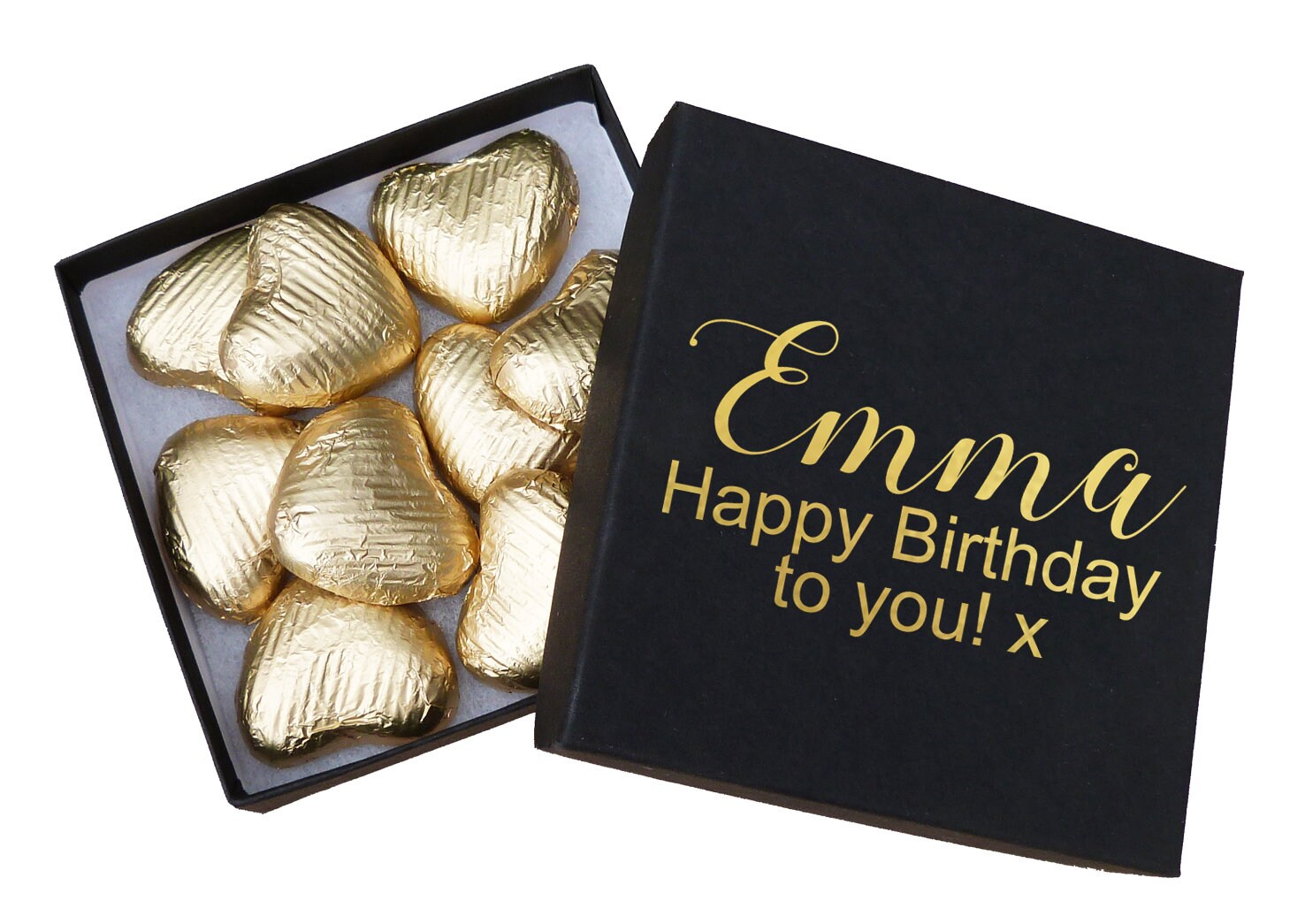 Personalised chocolates gift box gold foil Happy birthday name message love heart sweets
