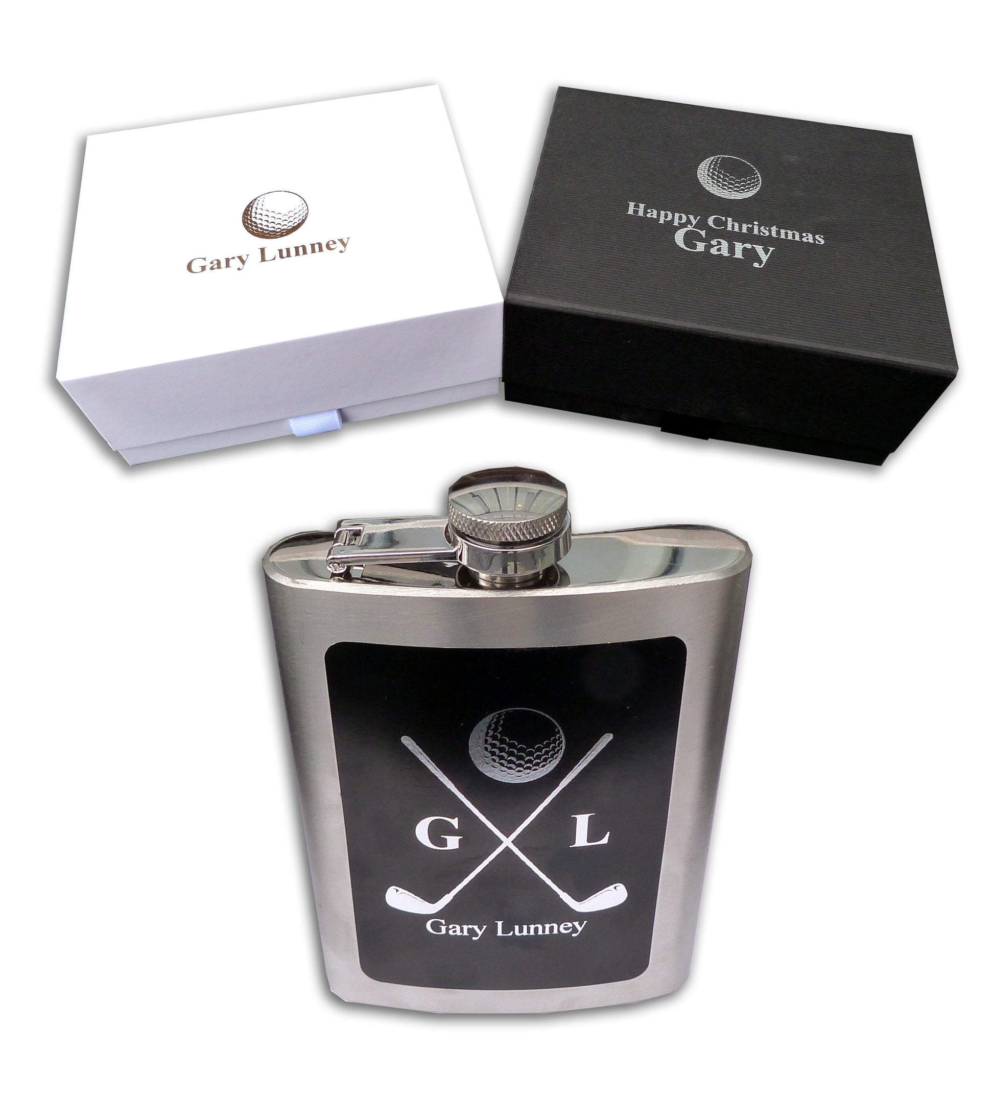 Personalised golf gift box socks, balls, tees, hip flask custom print christmas birthday golfer set