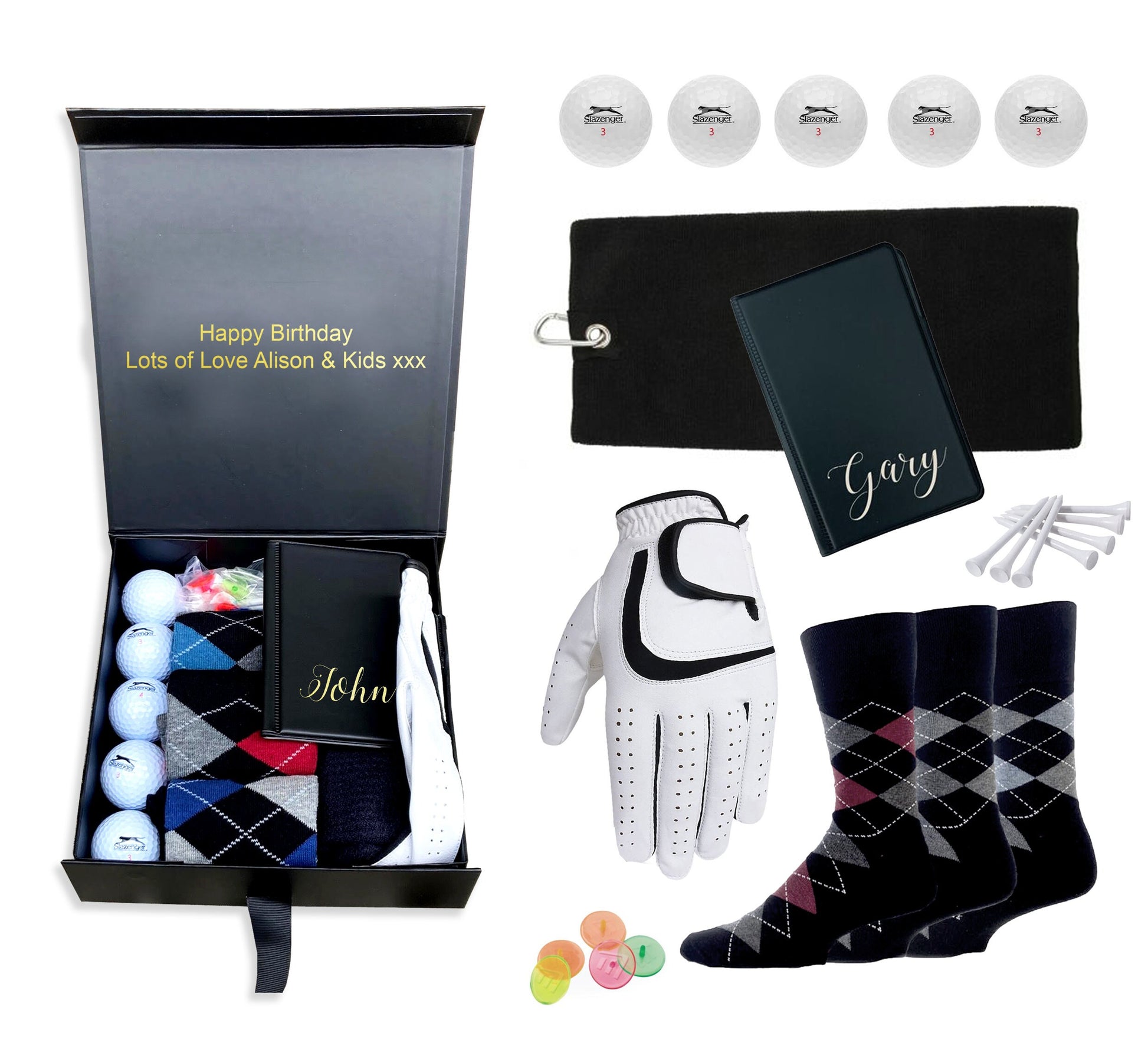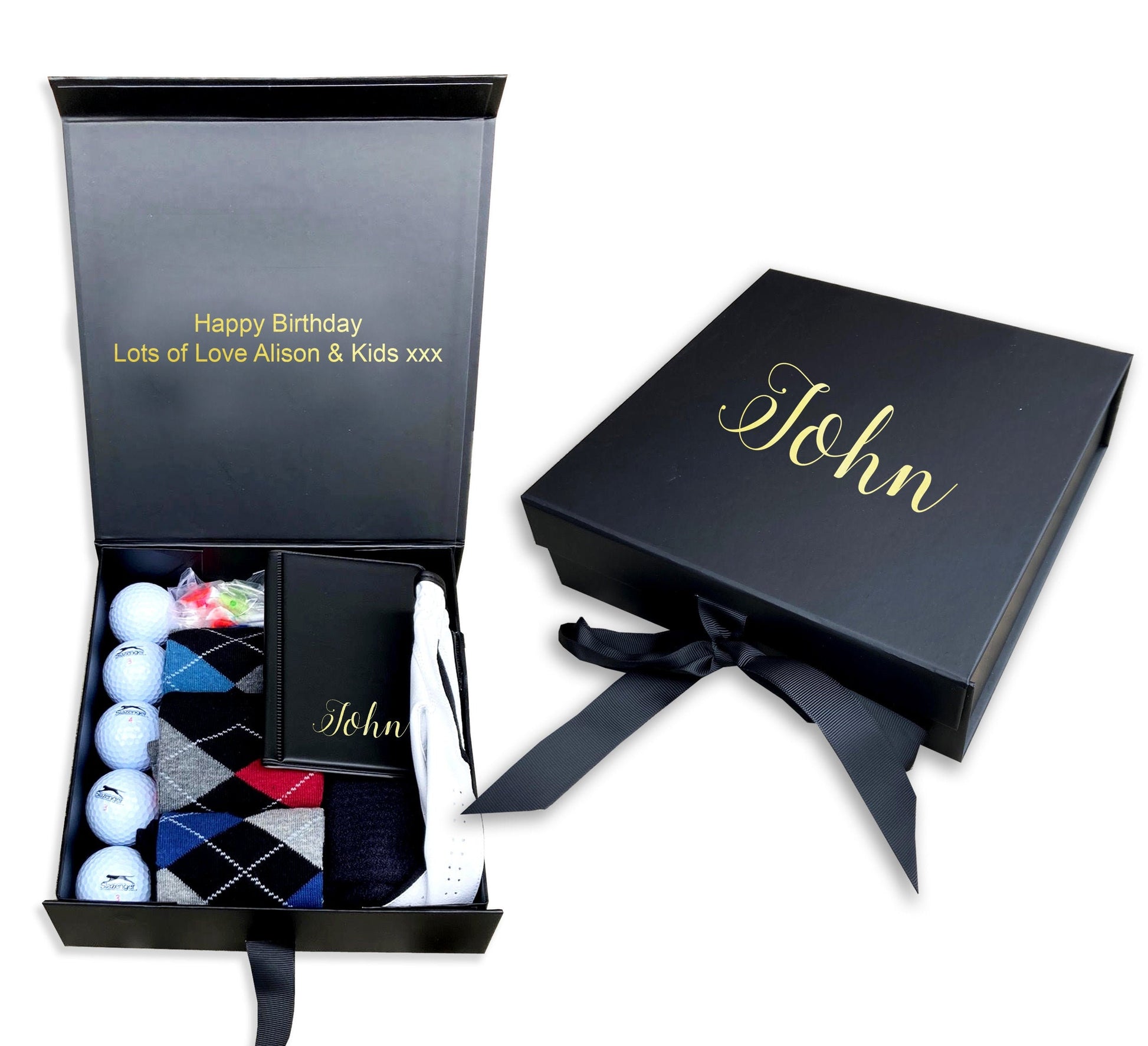 Personalised large black mangetic golf gift box filled socks, balls, towel, glove scorecard mens gift birthday